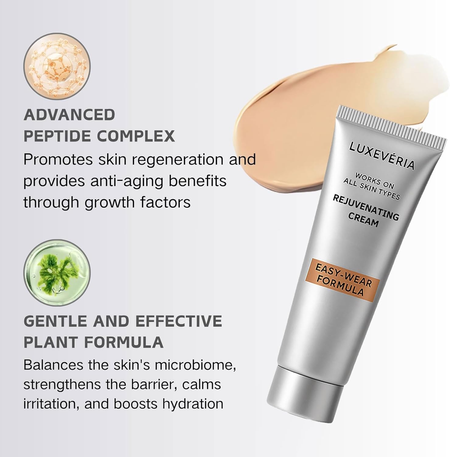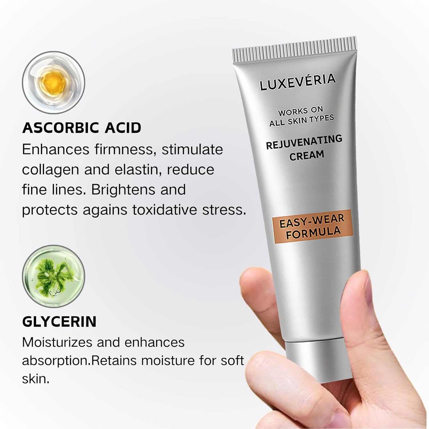 Luxevéria melts into your skin like silk, instantly blurring fine lines and leaving your complexion glowing, hydrated, and naturally flawless.